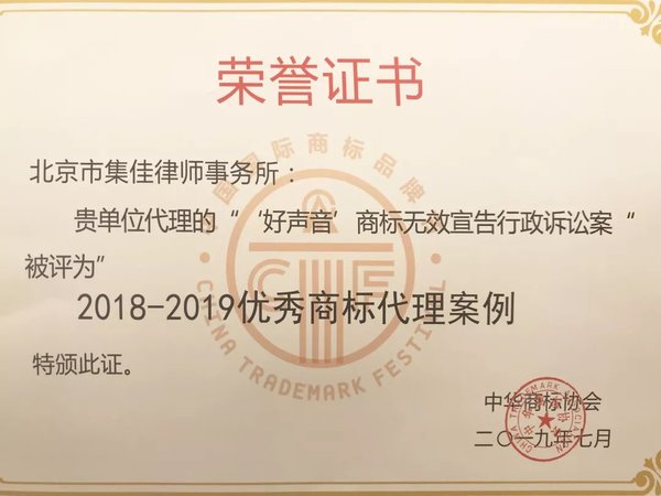 >网球直播>关于我们>荣誉概览>2019>集佳代理“好声音”商标无效宣告行政案入选“优秀商标代理案例”
