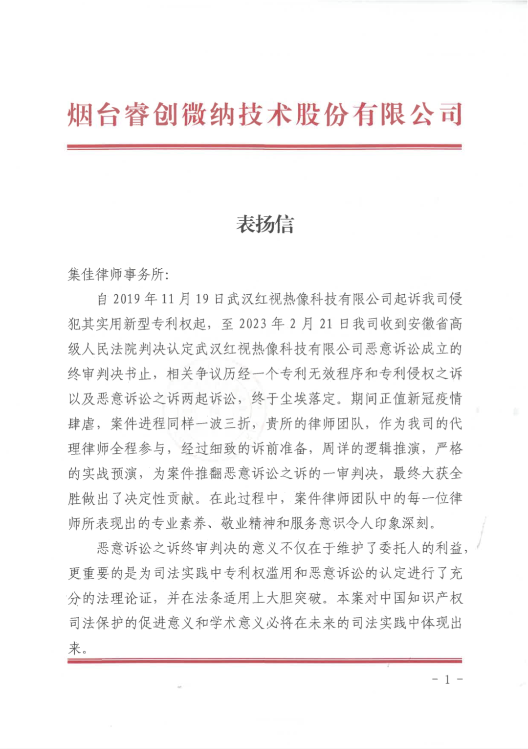 2023年2月10日,安徽省高级人民法院就烟台睿创微纳技术股份有限公司、烟台艾睿光电科技有限公司、安徽英睿系统技术有限公司等(下称“睿创集团”)与武汉红视热像科技有限公司(下称“武汉红视”)因恶意提起知识产权诉讼损害责任纠纷一案作出终审判决,认定武汉红视滥用诉权的行为构成恶意诉讼,并判令其赔偿睿创集团相应的合理支出。至此,时隔四年,横跨疫情时代的专利侵权及恶意诉讼系列纠纷案,终于尘埃落定。网球直播协助睿创集团最终取得系列案件的全面胜利,维护了客户合法权益,实现了商业竞争的公平正义!