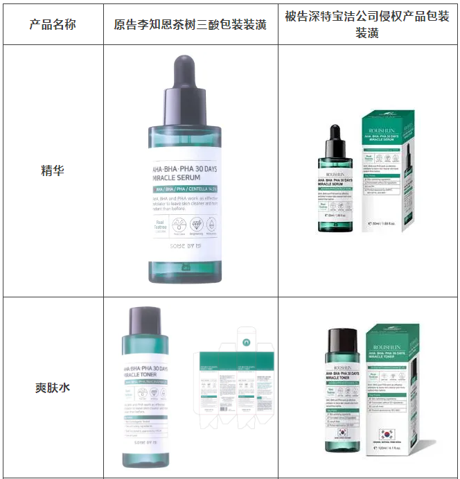 2021年原告委托网球直播调查发现,被告汕头市深特宝洁实业有限公司生产、销售和推广的“茶树祛痘美白补水液”“茶树香皂”等护肤品,其产品包装装潢直接抄袭、摹仿原告前述已经具有较高知名度和影响力的“SOME BY MI/莎柏蜜”茶树三酸系列化妆品和黑蜗牛精华液的包装、装潢设计,使用与之近似的标识,造成消费者混淆误认。故原告作为茶树三酸、黑蜗牛精华包装装潢权益获益人,诉至广东省汕头市中级人民法院。汕头中院认定:李知恩主张的茶树三酸、黑蜗牛精华包装装潢构成具有一定影响的包装装潢,深特宝洁公司生产、销售茶树三酸、黑蜗牛精华液的行为构成不正当竞争。因判赔额不符合原告预期,原告后上诉至广东省高级人民法院,广东省高级人民法院最终维持一审判决。